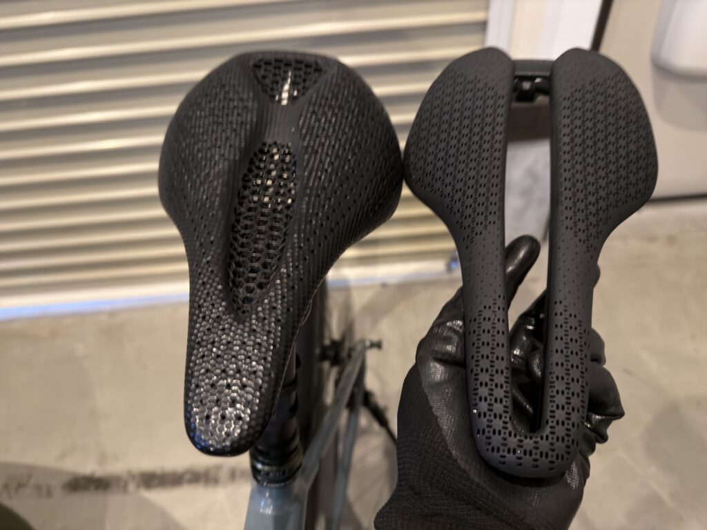 個人的に3Dプリントサドルの大きなメリットは通気性だと思っています。 フォーム素材のサドルだと、お尻とサドルの間に空気が逃げるスペースがなく蒸れやすいのですが、3Dプリント構造なら細かい穴から熱や湿気が抜けてくれるので快適。 汗で肌荒れしやすい自分にとっては、これはかなり大きなポイントです。